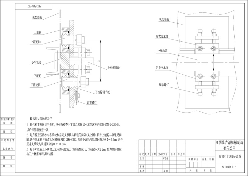 壓棉小車(chē)上有滾輪機(jī)構(gòu),當(dāng)壓棉小車(chē)運(yùn)行時(shí),滾輪始終在導(dǎo)軌上滾動(dòng),運(yùn)行阻力小,左右下滾輪可調(diào)節(jié)。小車(chē)裝有下刀片,上下刀片之間的間隙大于2毫米。