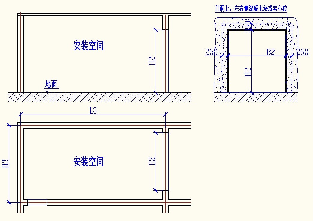 最小安裝空間見(jiàn)前表格。安裝地基平整,預(yù)留空洞位置尺寸準(zhǔn)確。