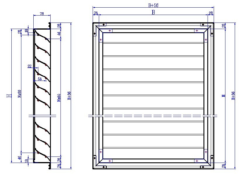 For installation, pre-opened holes on the wall are needed. Size of pre-opened hole is B×H. Air capacity adjusting window is installed directly on the wall, fixed by plug bolt all around; while louver should be inserted into mounting hole firstly, leaving frame on the wall, then fixed by plug bolt all around.