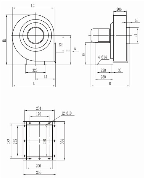 用戶使用時(shí),風(fēng)機(jī)可安裝于地面,小風(fēng)機(jī)也可直接安裝于纖維分離器、集塵器等設(shè)備或墻壁旁的支架上。(結(jié)構(gòu)尺寸詳見下頁(yè))