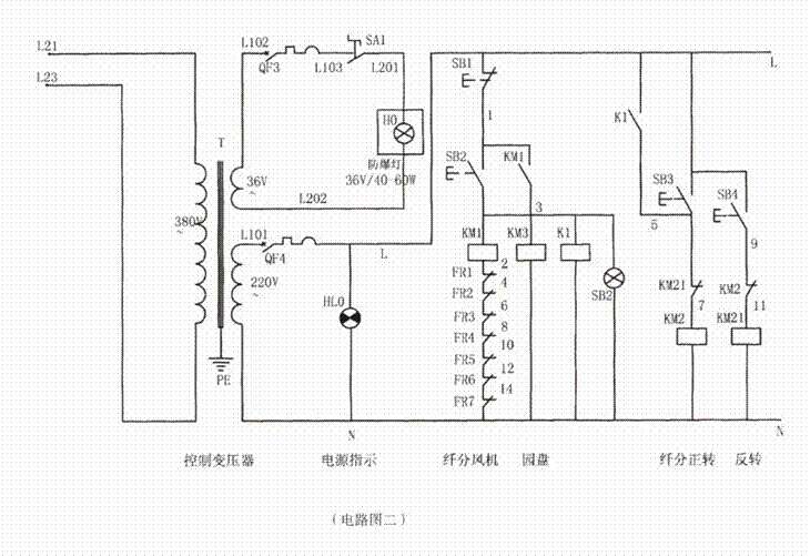 主風(fēng)機(jī)運(yùn)行:按下主風(fēng)機(jī)啟動(dòng)(SB8)主風(fēng)機(jī)作降壓?jiǎn)?dòng),15秒后(KT4,整定),主風(fēng)機(jī)全壓運(yùn)行。