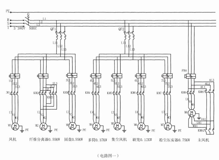 濾塵機(jī)組運(yùn)行:將各部件按鈕調(diào)到自動(dòng)檔,按下濾塵啟動(dòng)(SB2),纖分風(fēng)機(jī),纖維分離器,圓盤,集塵風(fēng)機(jī),多筒開始作業(yè)。10分鐘后(KT1,整定)多筒,集塵風(fēng)機(jī)停止工作,刷龍粉塵壓實(shí)器開始工作,3分鐘后(KT2,整定)刷籠停止,(粉塵壓實(shí)器繼續(xù)工作2分鐘,然后KT3整定)。多筒,集塵風(fēng)機(jī)啟動(dòng),開始下一循環(huán)。這樣周而復(fù)始,持續(xù)工作。也可根據(jù)實(shí)際工作情況,對(duì)各時(shí)間繼電器作適當(dāng)調(diào)整。